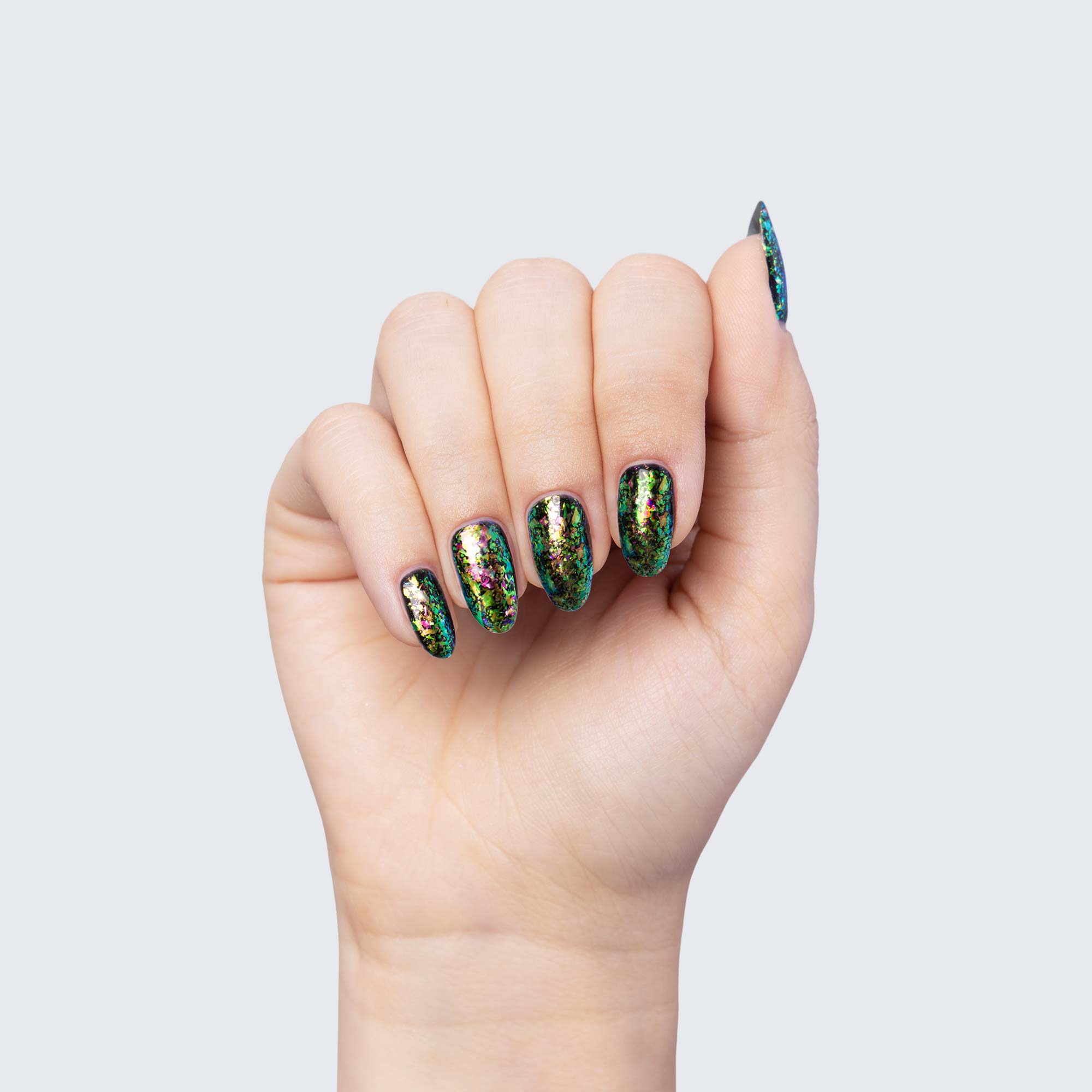 The ethereal allure of PRECIOUS FLAKES makes them a marvelous choice for manicures whose beauty can outreach any stretch of imagination. Because they are semi-translucent, each individual colour scheme takes on surprisingly varied hues depending on which gel polish you use as a base.