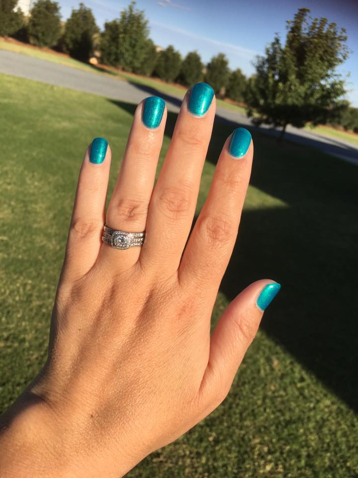 Peacock blue. Medium. Pearl finish. Sheer. Cool undertone.